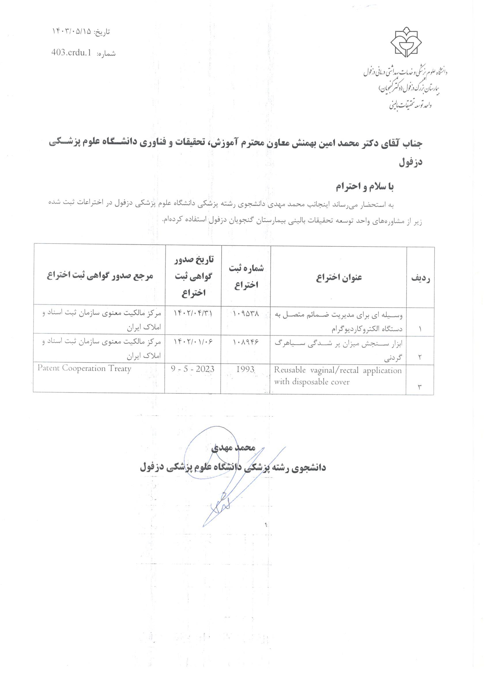 اختراعات ثبت شده با همکاری واحد توسعه تحقیقات بالینی در سال 2023